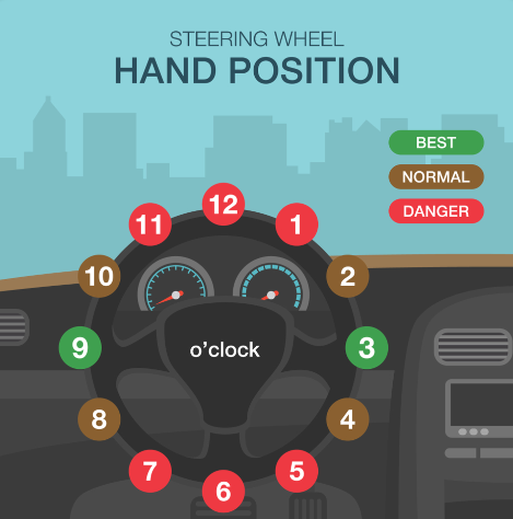- Keep thumbs up along the wheel to help prevent injuries in a collision